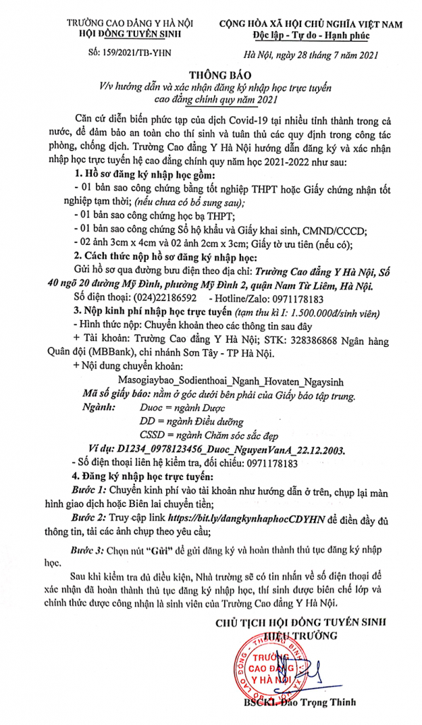 Do diễn biến phức tạp của dịch Covid-19 tại nhiều tỉnh thành trong cả nước, để đảm bảo an toàn cho thí sinh và tuân thủ các quy định trong công tác phòng, chống dịch. Trường Cao đẳng Y Hà Nội hướng dẫn đăng ký và xác nhận nhập học trực tuyến hệ cao đẳng chính quy năm học 2021-2022 như sau: